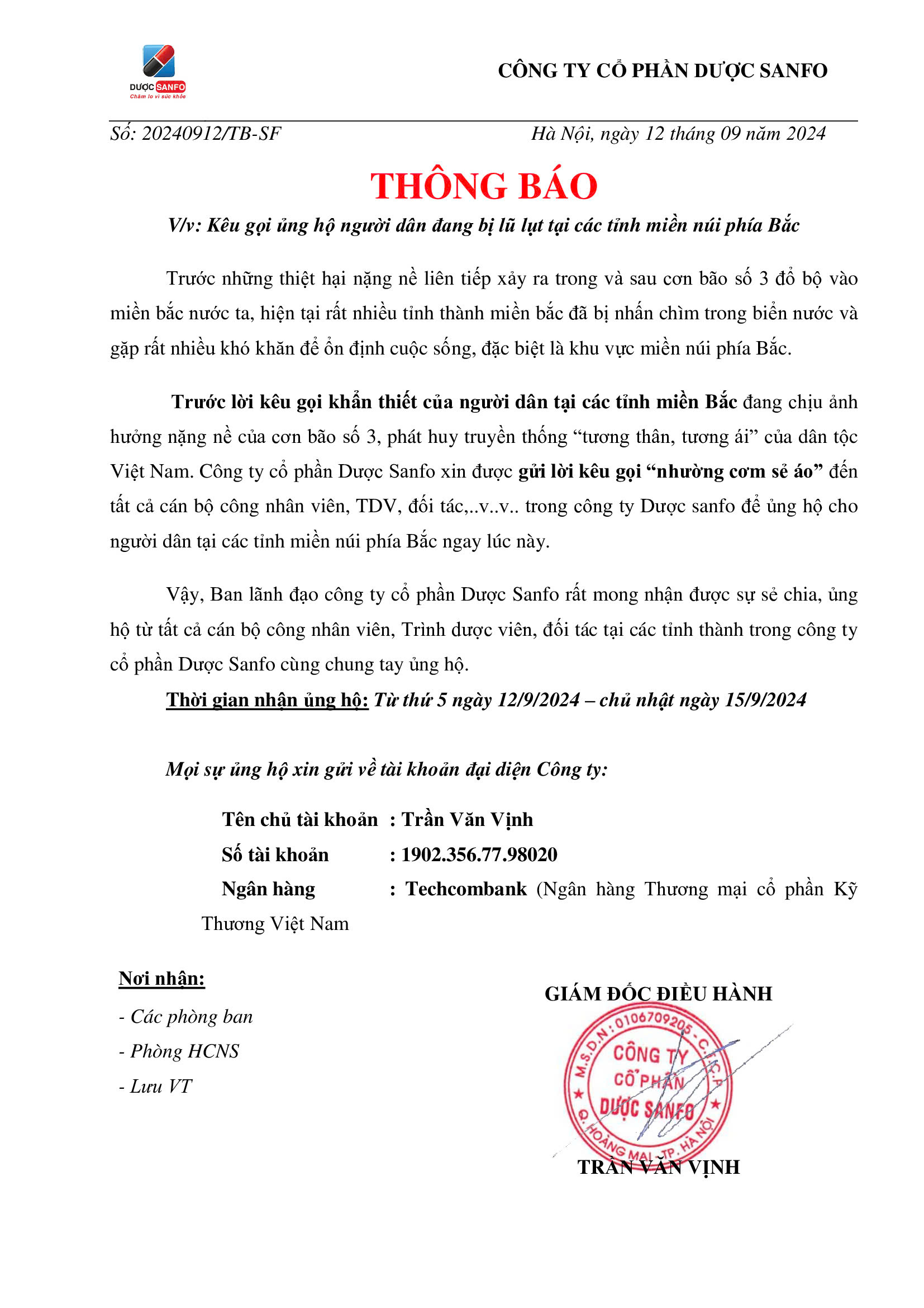Trước lời kêu gọi khẩn thiết của người dân tại các tỉnh miền Bắc đang chịu ảnh hưởng nặng nề của cơn bão số 3, phát huy truyền thống “tương thân, tương ái” của dân tộc Việt Nam. Công ty cổ phần Dược Sanfo xin được gửi lời kêu gọi “nhường cơm sẻ áo” đến tất cả cán bộ công nhân viên, TDV, đối tác,..v..v.. trong công ty Dược sanfo để ủng hộ cho người dân tại các tỉnh miền núi phía Bắc ngay lúc này.