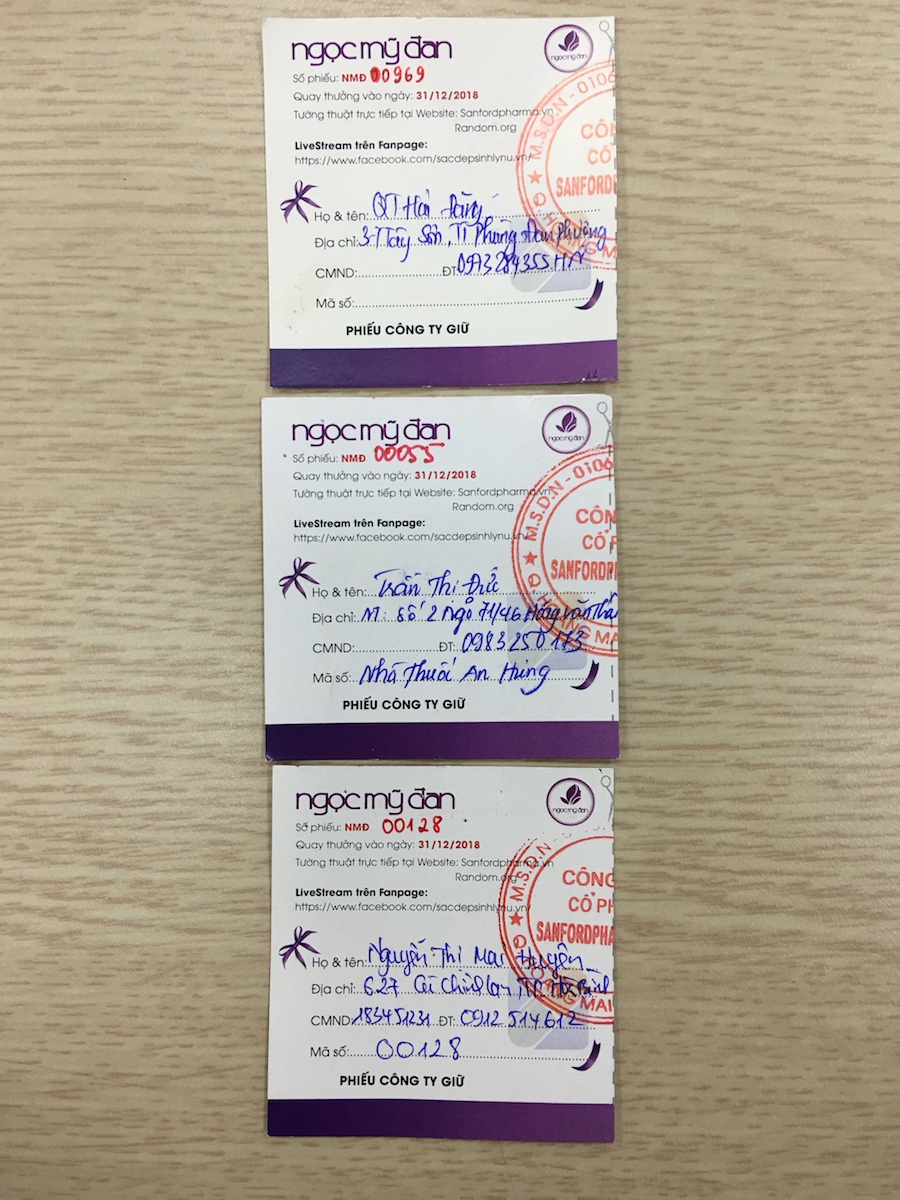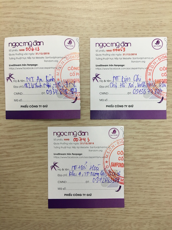 Sau nhiều tháng triển khai, chương trình nhận được rất nhiều sự quan tâm và ủng hộ của quý khách hàng. Nhãn hàng Ngọc Mỹ Đan - công ty đã chính thức quay thưởng công khai và tìm ra chủ nhân của chiếc SH Mode 2018 là nhà thuốc An Bình- 182 Lê Thanh Nghị, Q.Hải Châu, TP. Đà Nẵng. Giải nhì chiếc Iphone X thuộc về Nhà Thuốc Kim Chi, Chợ Hồ Xá, Vĩnh Ninh, Quảng Trị và rất nhiều khách hàng trung giải khác.